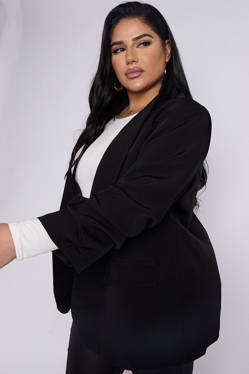 Elevate your wardrobe with our Plus Size Black Ruffle Sleeve Detail Blazer. Crafted with a sophisticated design and elegant ruffle sleeves, this blazer is perfect for any occasion. Complete with functional pockets, this premium piece is a must-have for the fashion-forward and discerning woman.