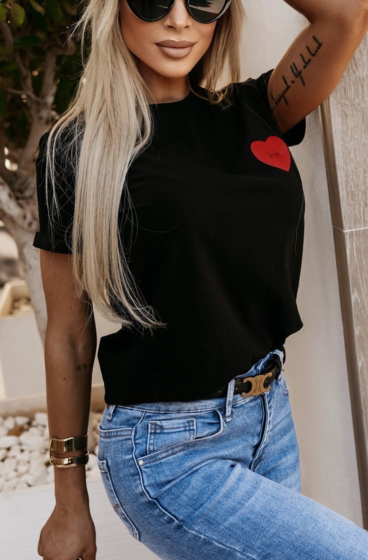 This “Love” heart printed t-shirt is sure to steal hearts with its playful yet meaningful design. Made from high-quality fabric, it provides both style and comfort. Show your love with a touch of humor and quirkiness. Perfect for any casual occasion.
