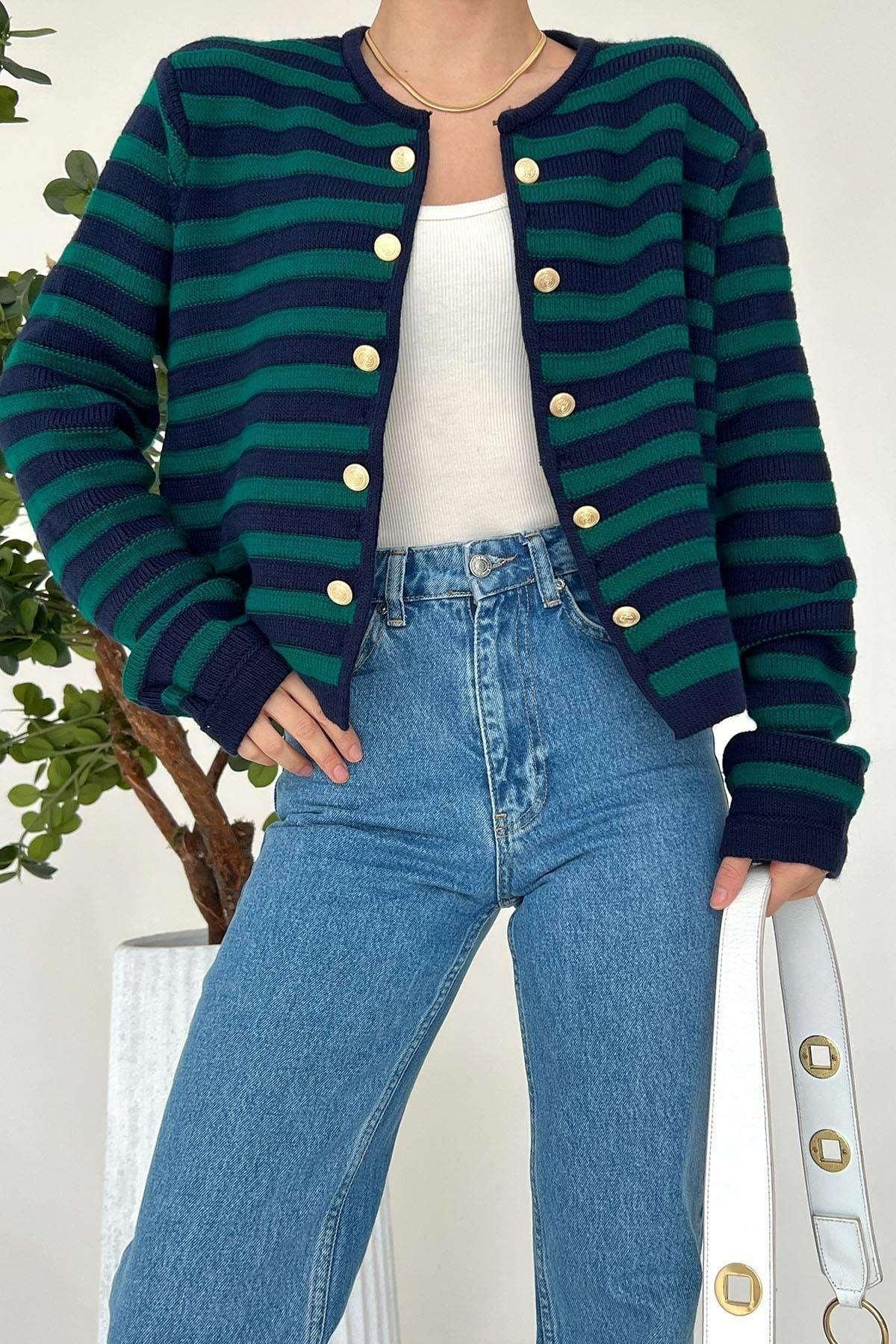 Introducing the Lyla Double Button Striped Cardigan, the perfect addition to your wardrobe. Made from high-quality fabric, this cardigan offers a sharp and smart look that is sure to elevate any outfit. Its sophisticated design makes it a great choice for formal events, while the stylish stripes add a touch of flair.