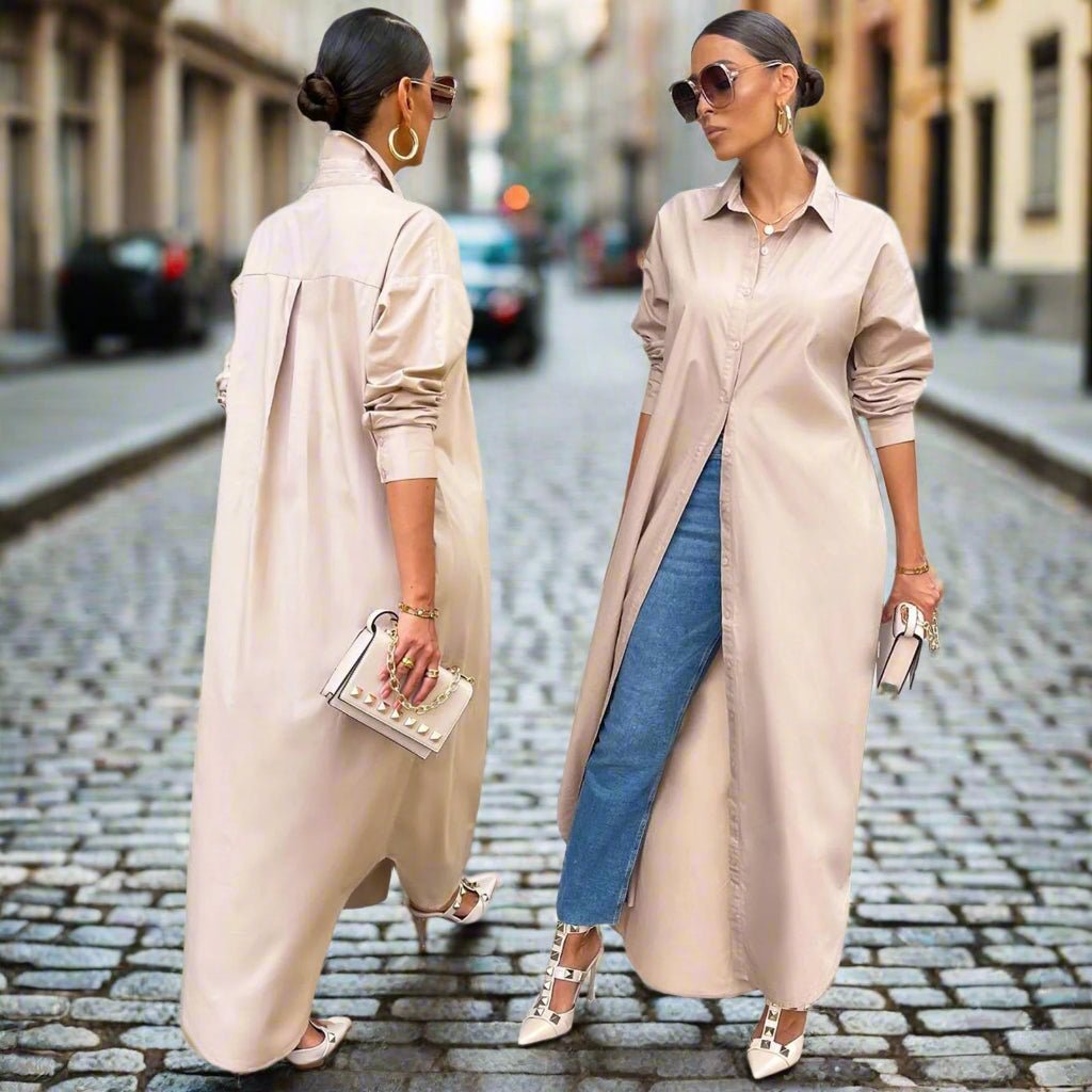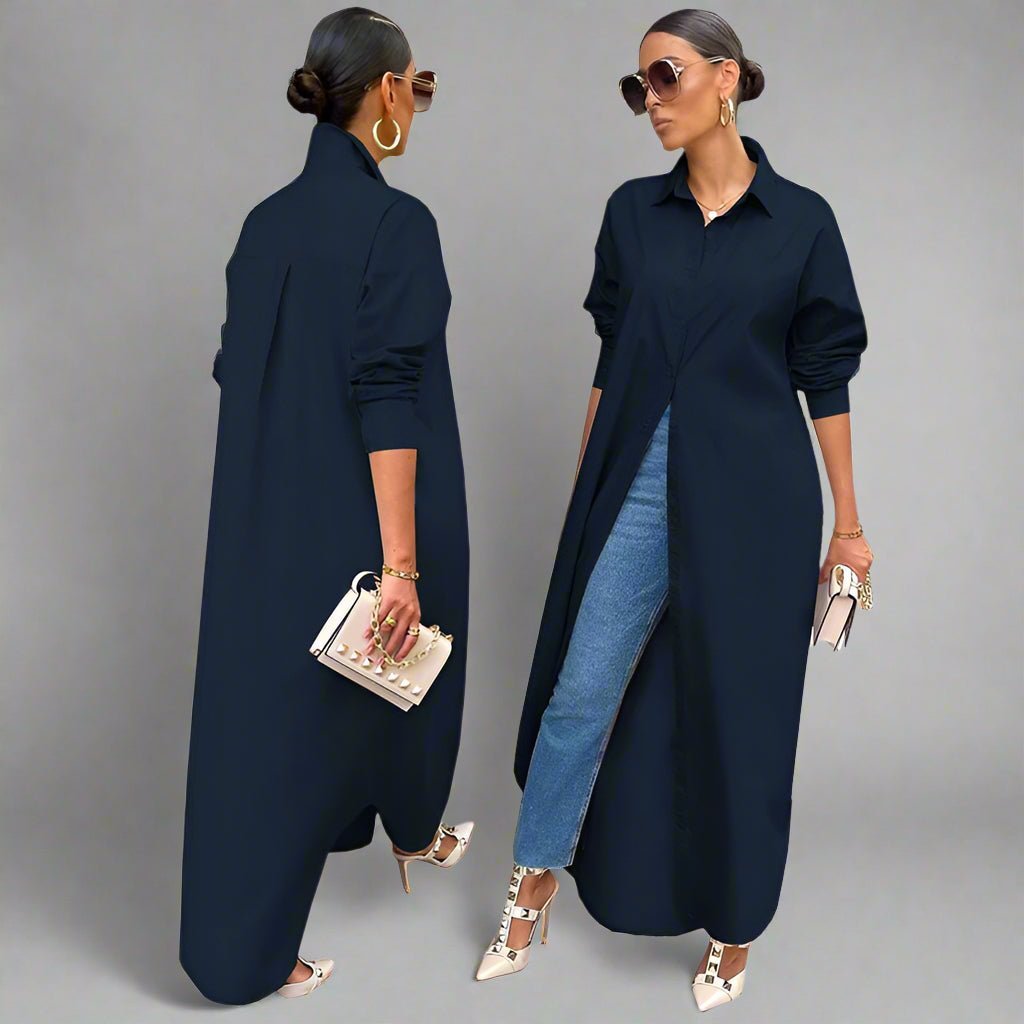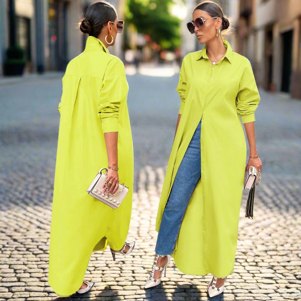 Step out in style with the Nanky Long Shirt Dress. This playful and versatile dress is the perfect addition to your wardrobe. With its long length and shirt-style design, it can be dressed up or down for any occasion. Stay comfortable and trendy with this quirky dress.