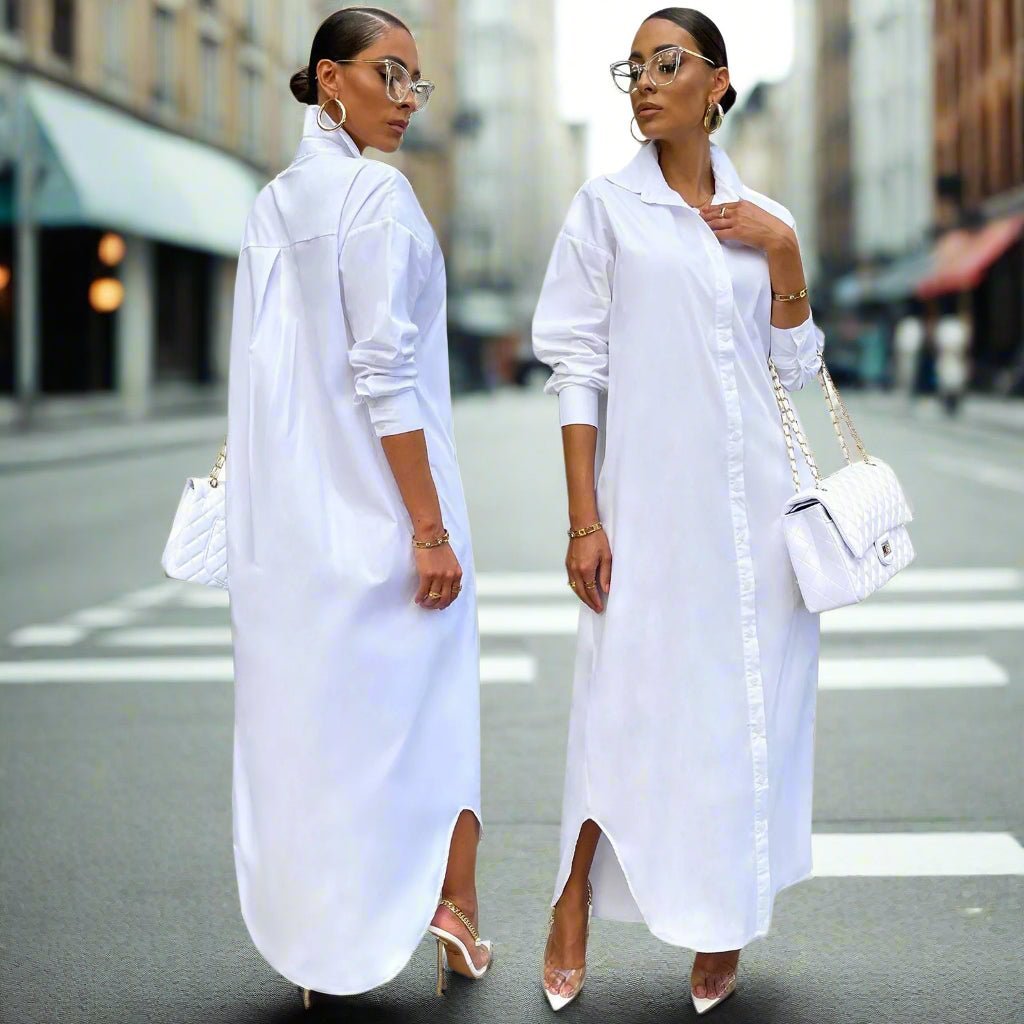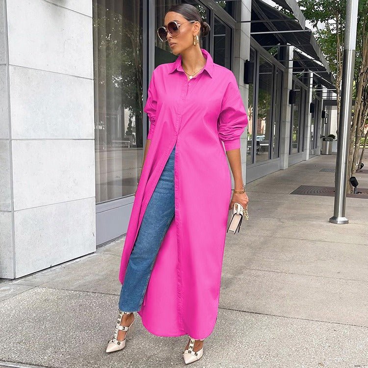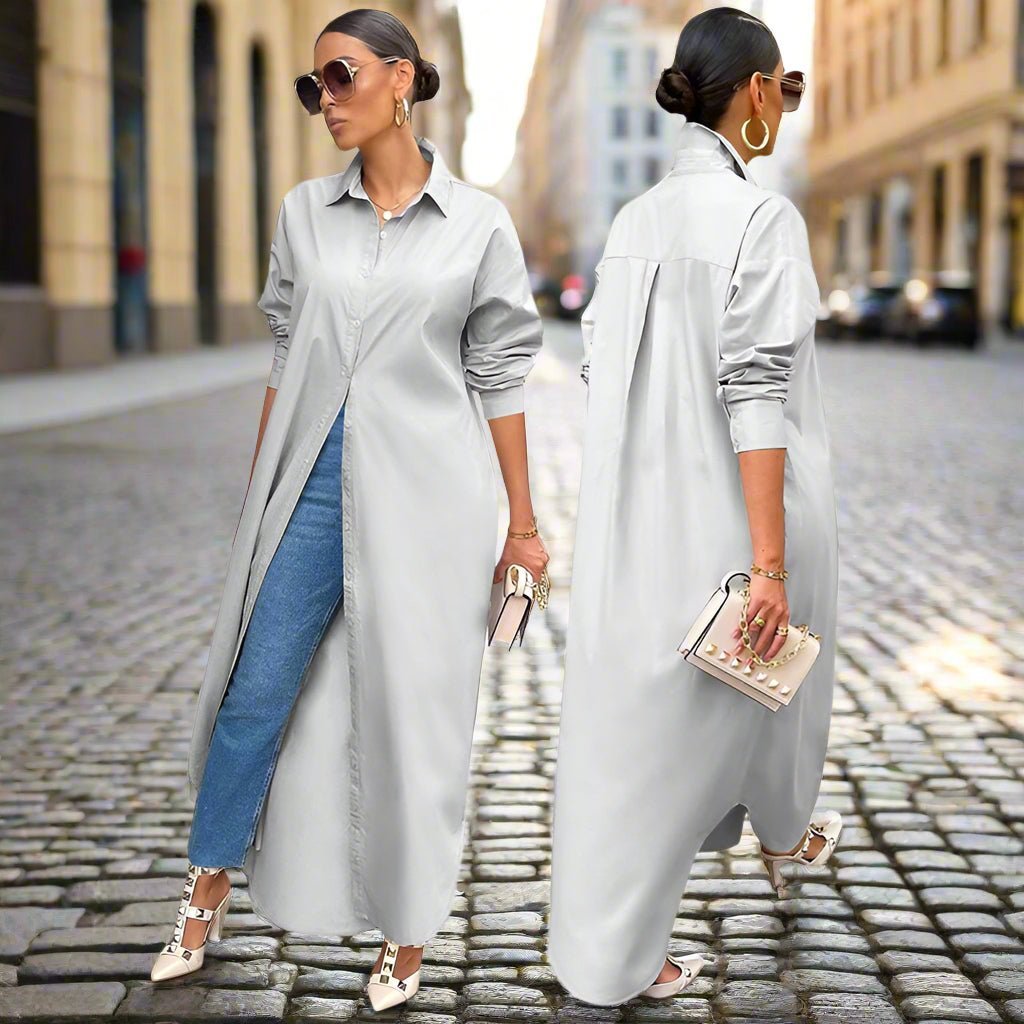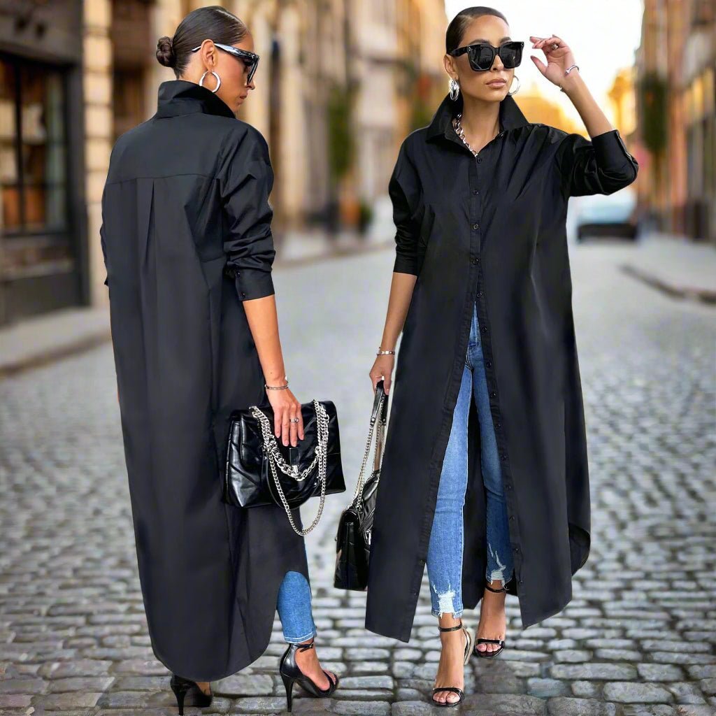 Step out in style with the Nanky Long Shirt Dress. This playful and versatile dress is the perfect addition to your wardrobe. With its long length and shirt-style design, it can be dressed up or down for any occasion. Stay comfortable and trendy with this quirky dress.