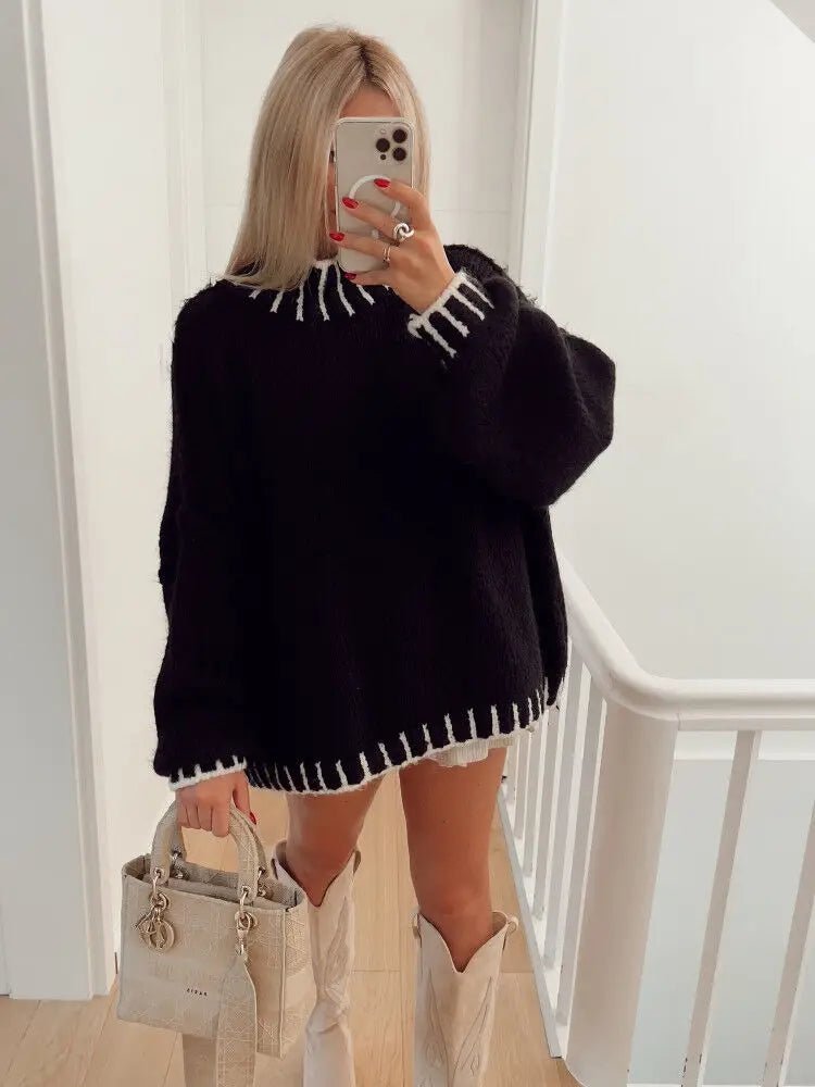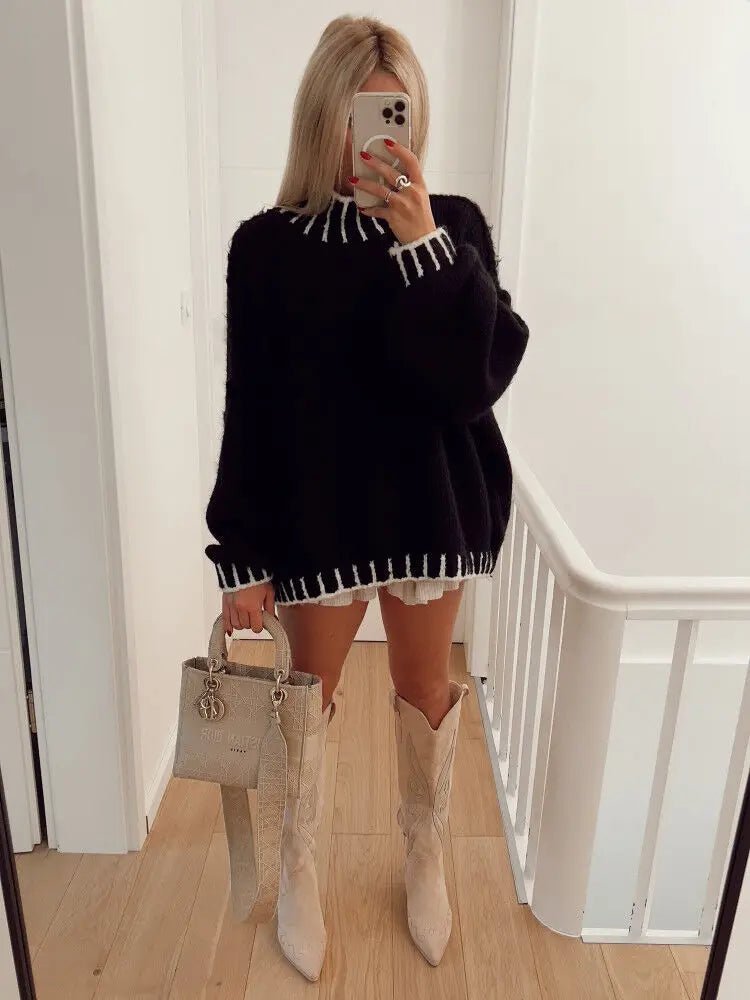 Indulge in luxury with our Suzy Turtleneck Patchwork Sweater. Crafted with the finest materials, this sweater features a classic turtleneck design and patchwork detailing for a unique touch. Stay warm and stylish all season long in this elegant and exclusive piece.